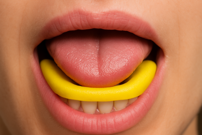 מצמידים בעדינות את סד הלשון – TongUp מעל השיניים התחתונות לחך העליון – פעולה שמפחיתה את צניחת הלשון לתוך קנה הנשימה ומונעת את תנודות האוויר שגורמות לנחירות וחריקת שיניים. כך נשמר מעבר אוויר פתוח, ומונע גם חריקת השיניים.